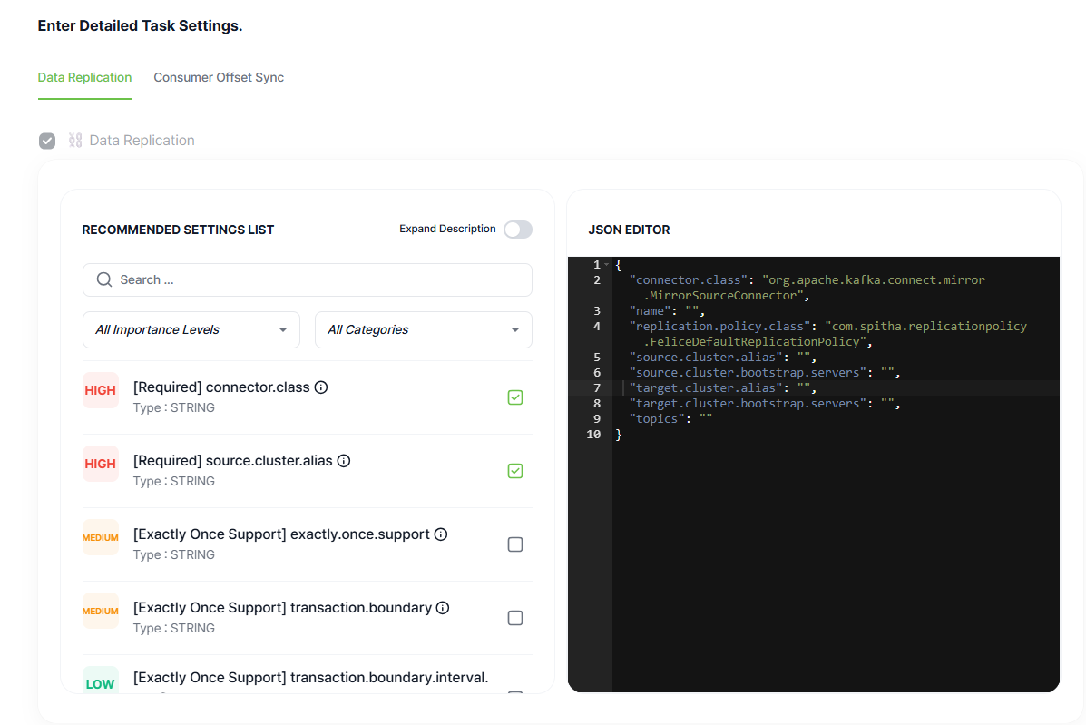 name: Name of the Data Replication Connectorconnector.class: Class name of the Data Replication Connectorreplication.policy.class: Policy for determining replicated topic names on the target cluster. Additional settings may be required for each policy.source.cluster.alias: Alias for the source clustersource.cluster.bootstrap.servers: Server information for connecting to the source clustertarget.cluster.alias: Alias for the target clustertarget.cluster.bootstrap.servers: Server information for connecting to the target clustertopics: Topics to replicate (single topic name or regular expression separated by commas)