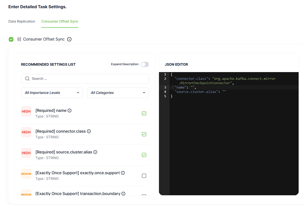 These are the settings for the Consumer Offset Synchronization Connector. Enter the configuration values for the Consumer Offset Synchronization Connector. You can enable or disable the use of the Consumer Offset Synchronization Connector by toggling the checkbox.