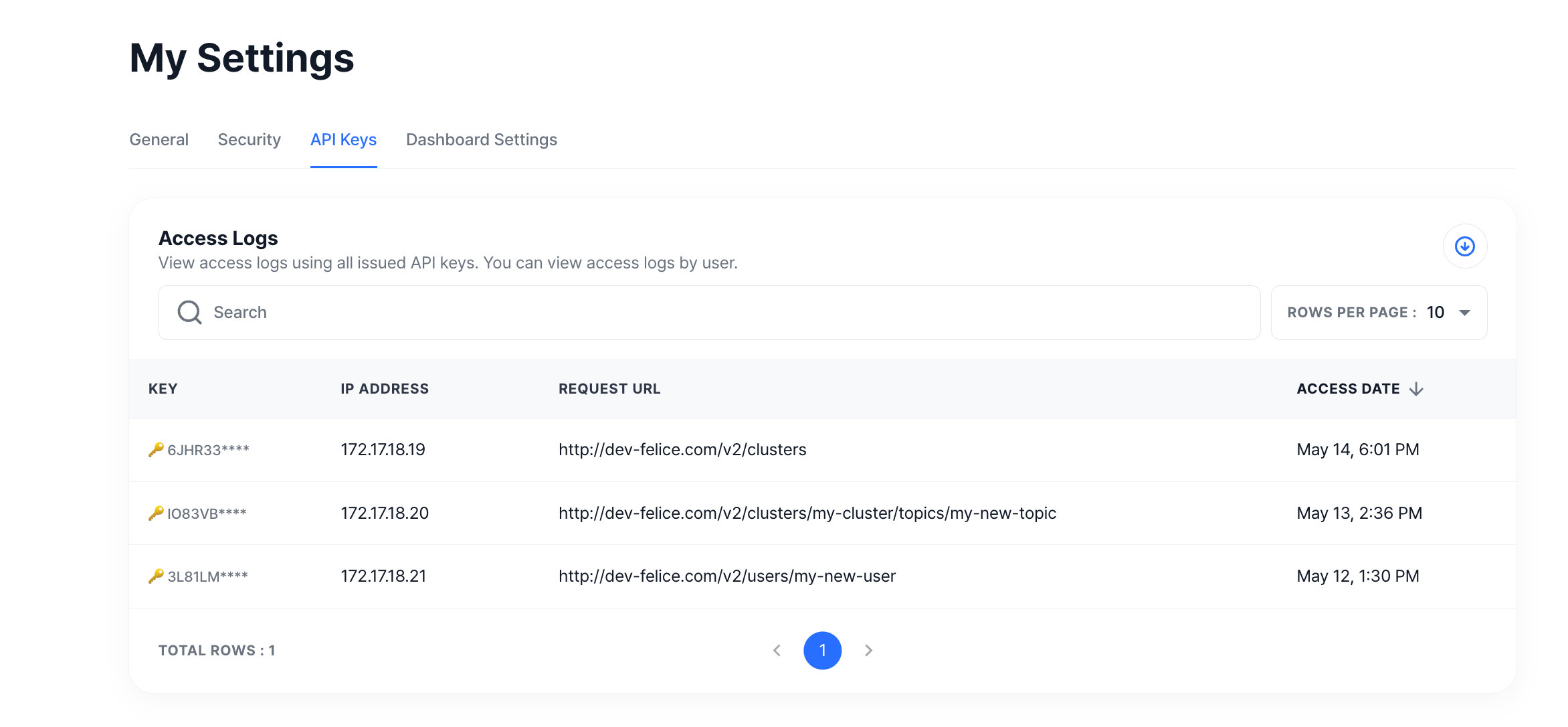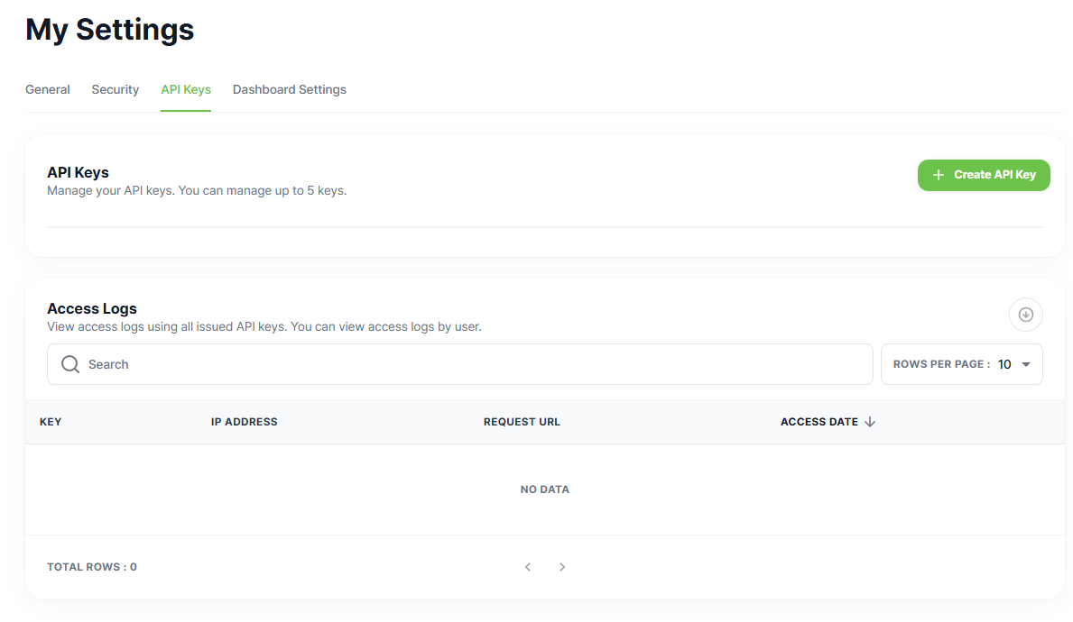 At the bottom of the Keys list, you can view all the API requests made using the API Key issued by the current user. You can view up to 500 access logs regardless of the key used.